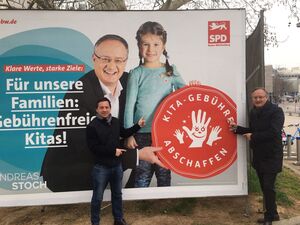 Die Landes-SPD setzt im Kommunalwahlkampf voll auf ihre Forderung nach gebührenfreien Kitas. Der Landesvorsitzende Andreas Stoch und Generalsekretär Sascha Binder präsentierten am Samstag vor der SPD-Zentrale in Stuttgart zum offiziellen Start der Wahlplakatierung ein entsprechendes Bildmotiv, das in den nächsten sechs Wochen auf Großflächen und rund 30.000 Kleinplakaten in Baden-Württemberg bis zur Wahl am 26. Mai zu sehen sein wird.