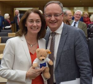 Die SPD-Landtagsfraktion feierte diese Woche 100 Jahre Frauenwahlrecht in Deutschland und lud sich zu diesem Anlass Bundesjustizministerin Katarina Barley in den Landtag ein. Als Dankeschön für Ihr Kommen überreichte Andreas Stoch, Heidenheimer SPD-Landtagsabgeordneter und Fraktionschef in Stuttgart, einen plüschigen Gruß aus seiner Heimat. „Der Steiff-Teddy ist eines der schönsten Produkte, das in Baden-Württemberg hergestellt wird“, ließ Stoch den hohen Gast wissen. Die Firma Steiff in Giengen hatte für die Bundespolitikerin, die im nächsten Jahr als Spitzenkandidatin für die SPD in die Europawahl zieht, als Glücksbringer extra einen Teddy mit EU-T-Shirt angefertigt.